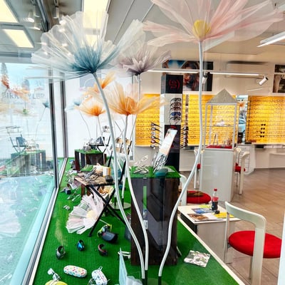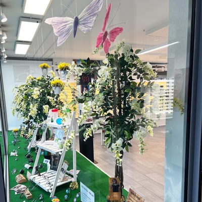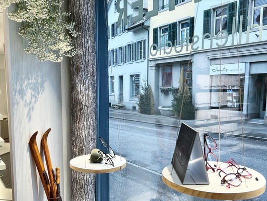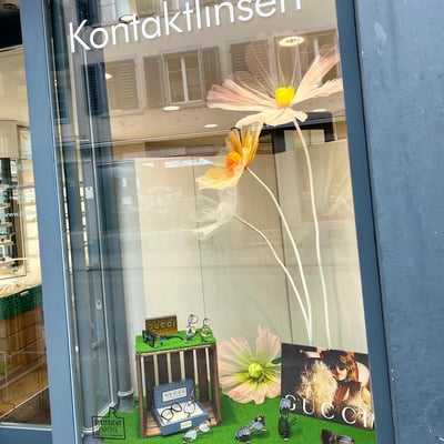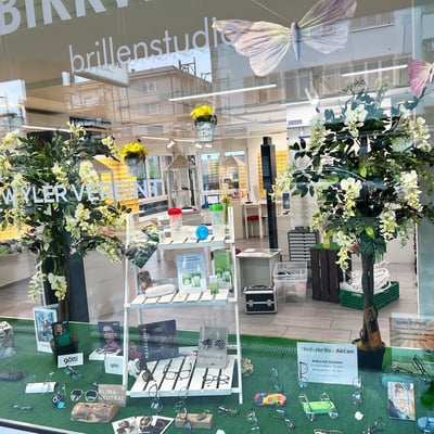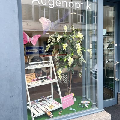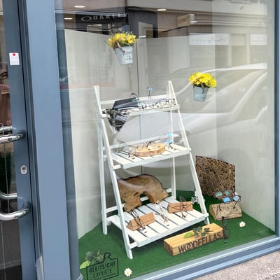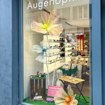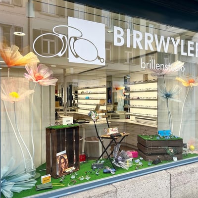 Anfangs März gestalteten wir die Schaufenster von Brillenstudio Birrwyler neu. Der Frühling nahm Einzug und die Dekorationselemente passten wir dementsprechend an.