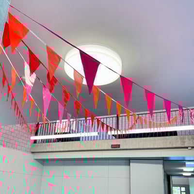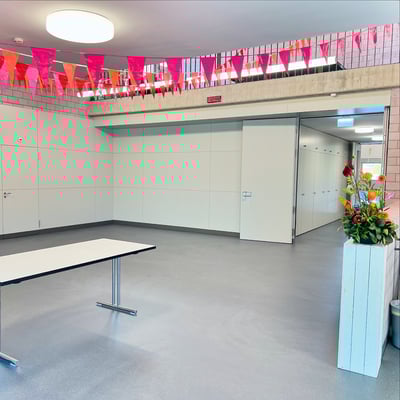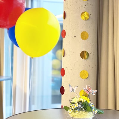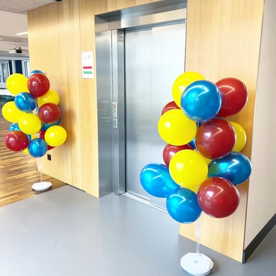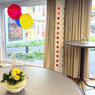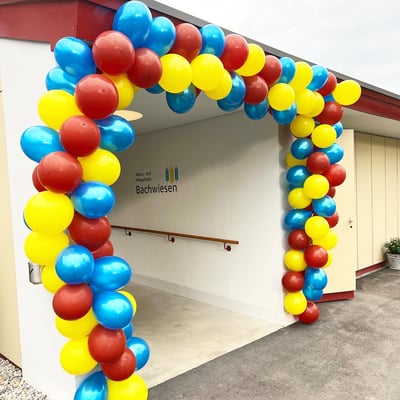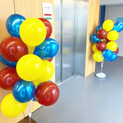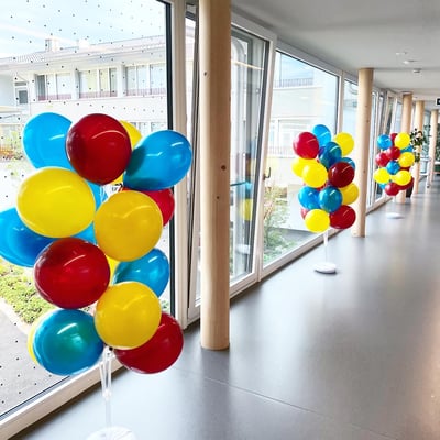 Farblich an die drei Hauptfarben der drei verschiedenen Gebäudetrakten angepasst, haben wir mit über 300 Ballonen, 27 Blumengestecke sowie Girlanden, die Eröffnungsfeier dekorativ begleitet.