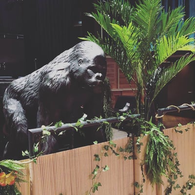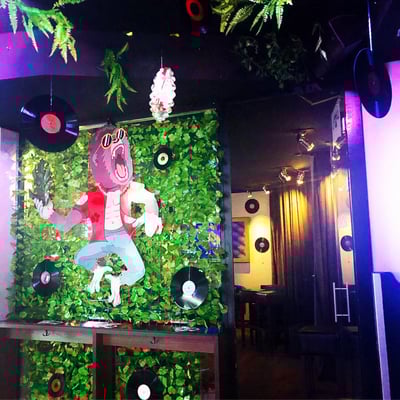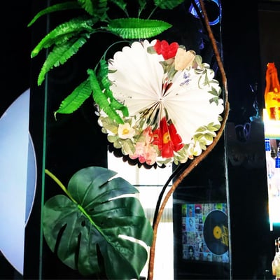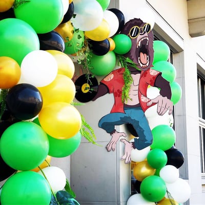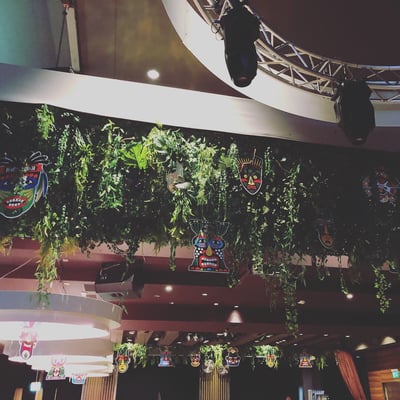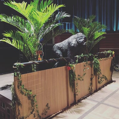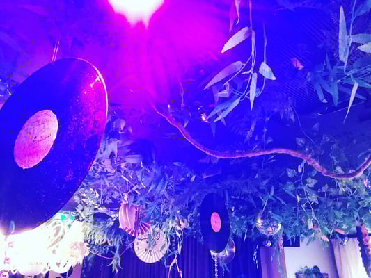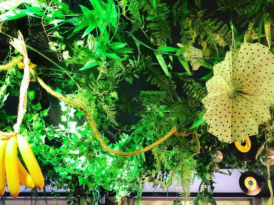 Passend dazu verwandelten wir den Paul Club in einen wilden Dschungel mit Bananen, Urwaldgewächs, Lianen, Faltrosetten und Schallplatten.