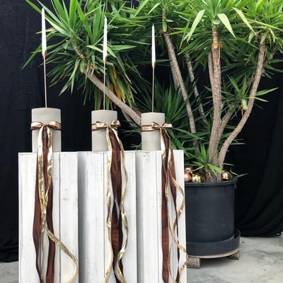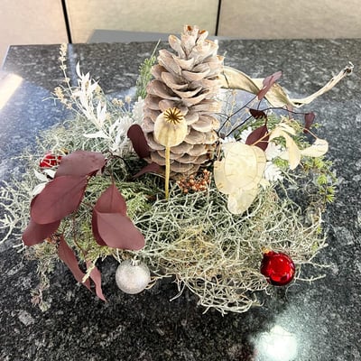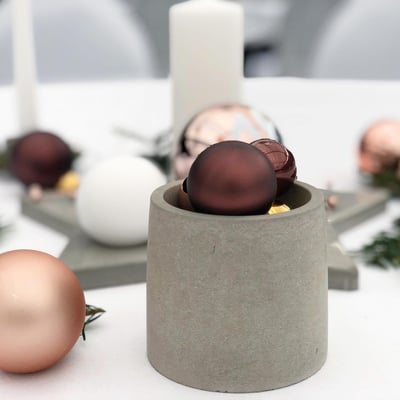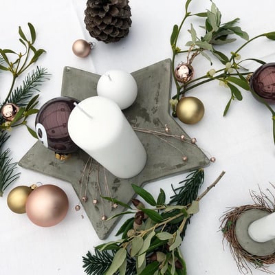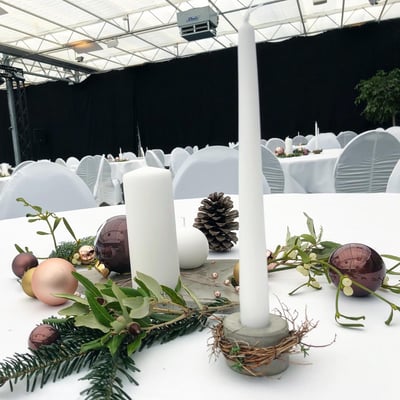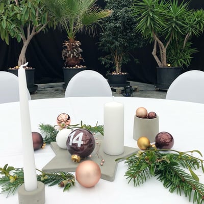 Architektur trifft auf Weihnachten. Hier durften wir die Tische, den Eingangsbereich und die Bäume der Gärtnerei Heimstätten in Wil für den Weihnachtsanlass von Marty Häuser AG dekorieren. Der Betonboden der Gärtnerei sowie die Marty Häuser AG als Architektur- und Immobilienfirma inspirierten uns zu einem Konzept mit Betonelementen.