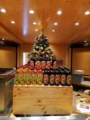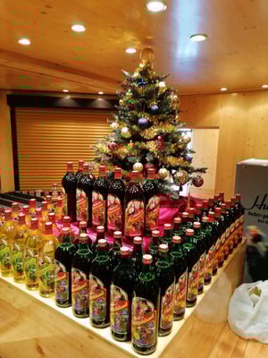 Weihnachtliche Dekoration für die Glühwein-Pyramide. Und damit auch der Glühwein zum Kaufen anregt, helfen wir gerne beim Visual Merchandising und setzten diese für unsere Kunden um.