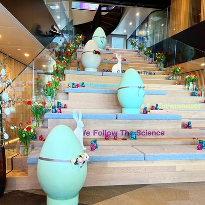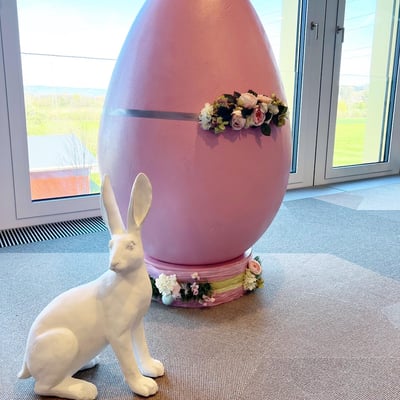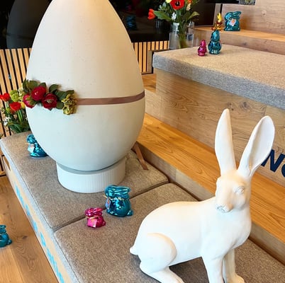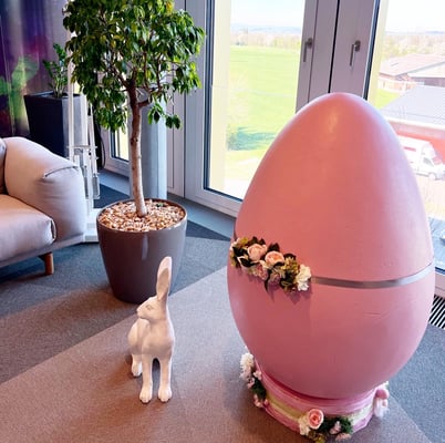 Kurzfristig können wir. Von der Anfrage bis zur Dekoration waren es 5 Tage. So brachten wir Ostern nach Baar und durften den Firmen-Mittelpunkt - die Treppe, mit unseren über 1m grossen Eier, österlich dekorieren.